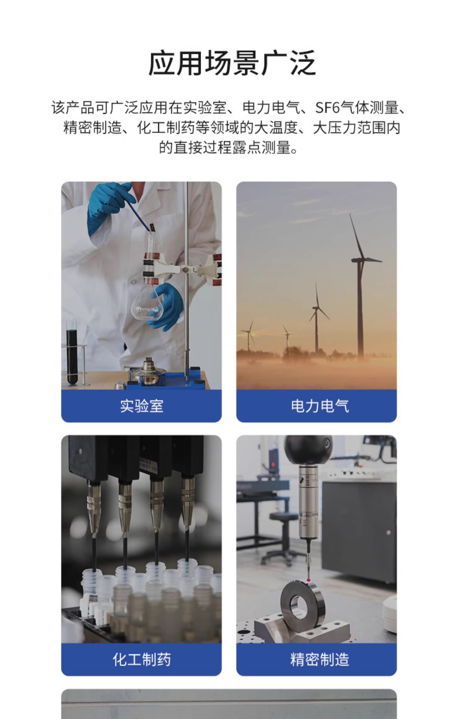 產(chǎn)品應(yīng)用 手持式露點儀是一種便捷、準(zhǔn)確、可靠的空氣濕度測量設(shè)備,其在實驗室、工業(yè)生產(chǎn)、環(huán)境監(jiān)測等領(lǐng)域中具有廣泛的應(yīng)用前景。 實驗室 在化學(xué)、生物、醫(yī)學(xué)等實驗室中常常需要測量空氣中的相對濕度和露點溫度以掌握實驗條件。 工業(yè)生產(chǎn) 在制造、加工、儲存等工業(yè)領(lǐng)域中,可用于監(jiān)測空氣中的水分含量,保障生產(chǎn)過程的穩(wěn)定性和質(zhì)量。 環(huán)境監(jiān)測 在氣象、環(huán)保、建筑等領(lǐng)域中,可用于監(jiān)測大氣中的相對濕度、露點溫度等指標(biāo),以便更好地了解環(huán)境狀態(tài)。 工業(yè)應(yīng)用 諸如空氣干燥設(shè)備、塑料注塑設(shè)備、手套箱干燥設(shè)備、鋰電池水分檢測、氫氣、二氧化碳、水份檢測等。