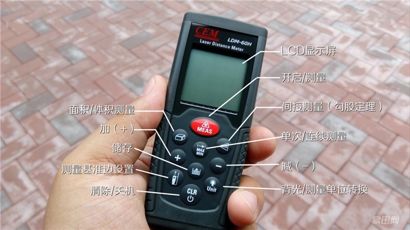 LDM-60H激光測距儀的功能按鍵為10鍵分布,紅色按鍵為開關(guān)鍵和測量按鍵。其他9鍵分別對應(yīng)日常測量工作所需的各種功能。激光測距儀可使用的范圍還是比較廣的,比如距離測量、房屋驗收、室內(nèi)裝修、家具安裝、工程測量、機械工程、交通消防、規(guī)劃行業(yè)、裝潢行業(yè)、倉庫物流、建筑施工等,所以,這9鍵對應(yīng)的功能還是很實用的。后邊,筆者將就自己用到的一些功能分享出來。